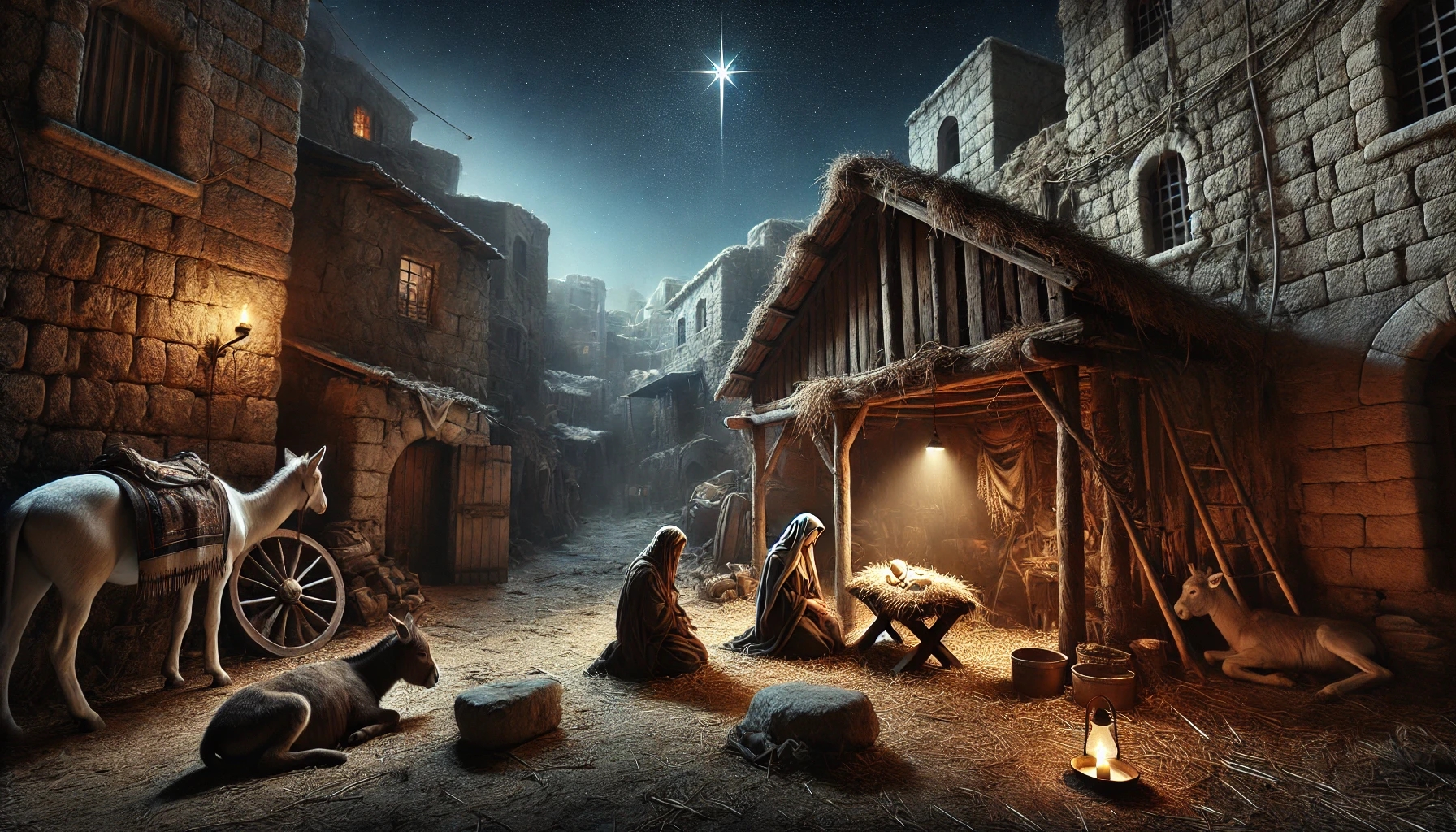 in einem Stall, bei Kerzenschein.