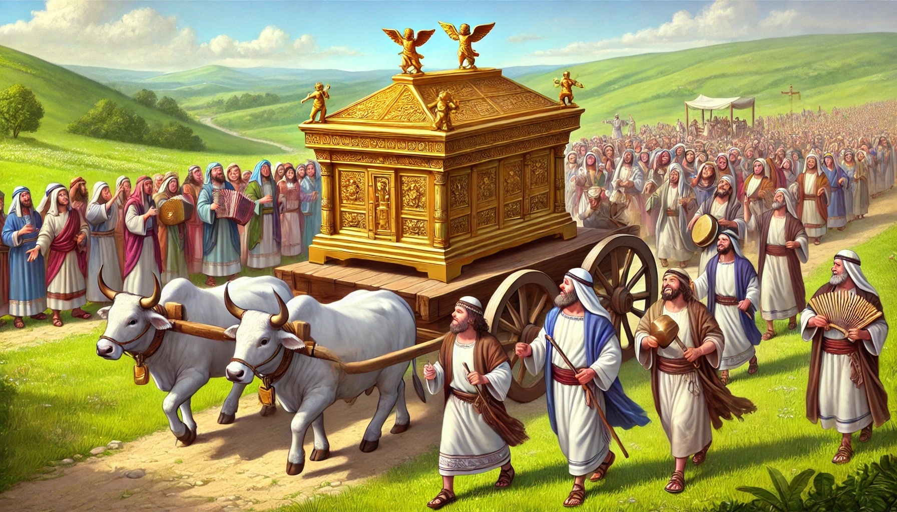 Er berät sich mit den Führern und dem Volk, und alle stimmen zu. Es wirkt wie ein gemeinsamer, freudiger Aufbruch. Die Lade wird geholt, begleitet von Musik, Jubel und Begeisterung. Die Atmosphäre ist lebendig, voller Emotion.