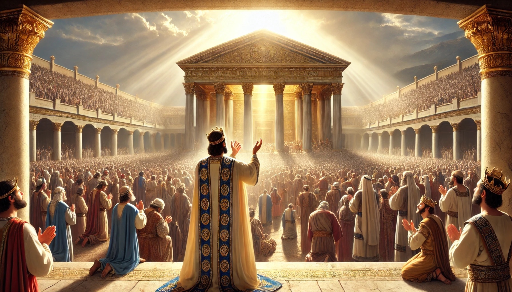 In 1. Könige 8 erreicht der Tempelbau seinen Höhepunkt: Die Bundeslade wird in den Tempel gebracht, und das Haus Gottes wird feierlich eingeweiht. Dieses Kapitel ist geprägt von Anbetung, Gebet und der sichtbaren Gegenwart Gottes unter seinem Volk.