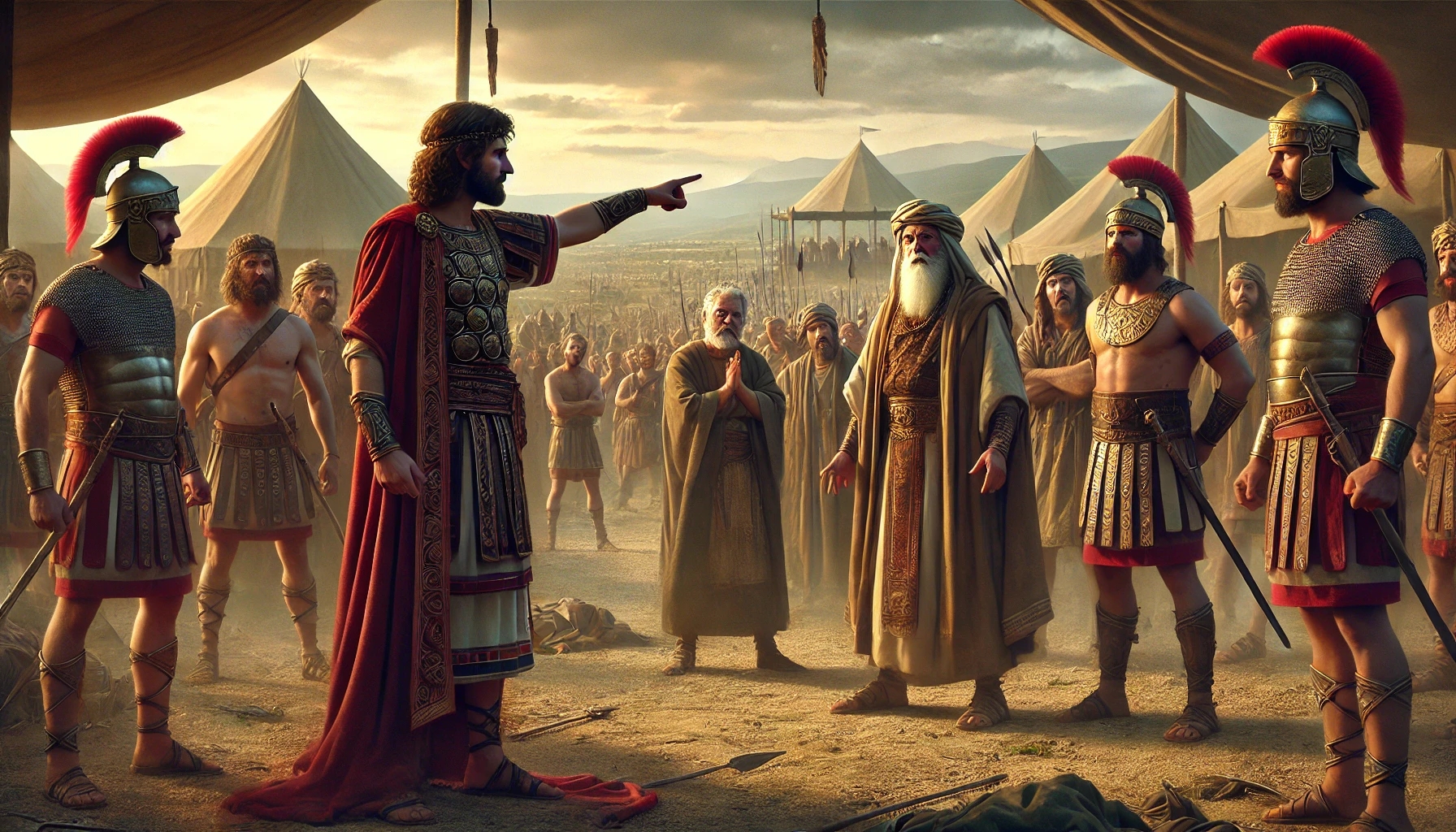 Doch Davids Anwesenheit sorgt für Unruhe. Die Fürsten der Philister erkennen ihn sofort: David, der Hebräer, der berühmte Krieger, über den gesungen wurde, dass er zehntausende erschlagen habe. Misstrauen keimt auf. Für sie ist klar: Ein Mann mit dieser Vergangenheit könnte im entscheidenden Moment zum Feind werden. Die Erinnerung an Davids Ruhm ist stärker als jede aktuelle Loyalität.