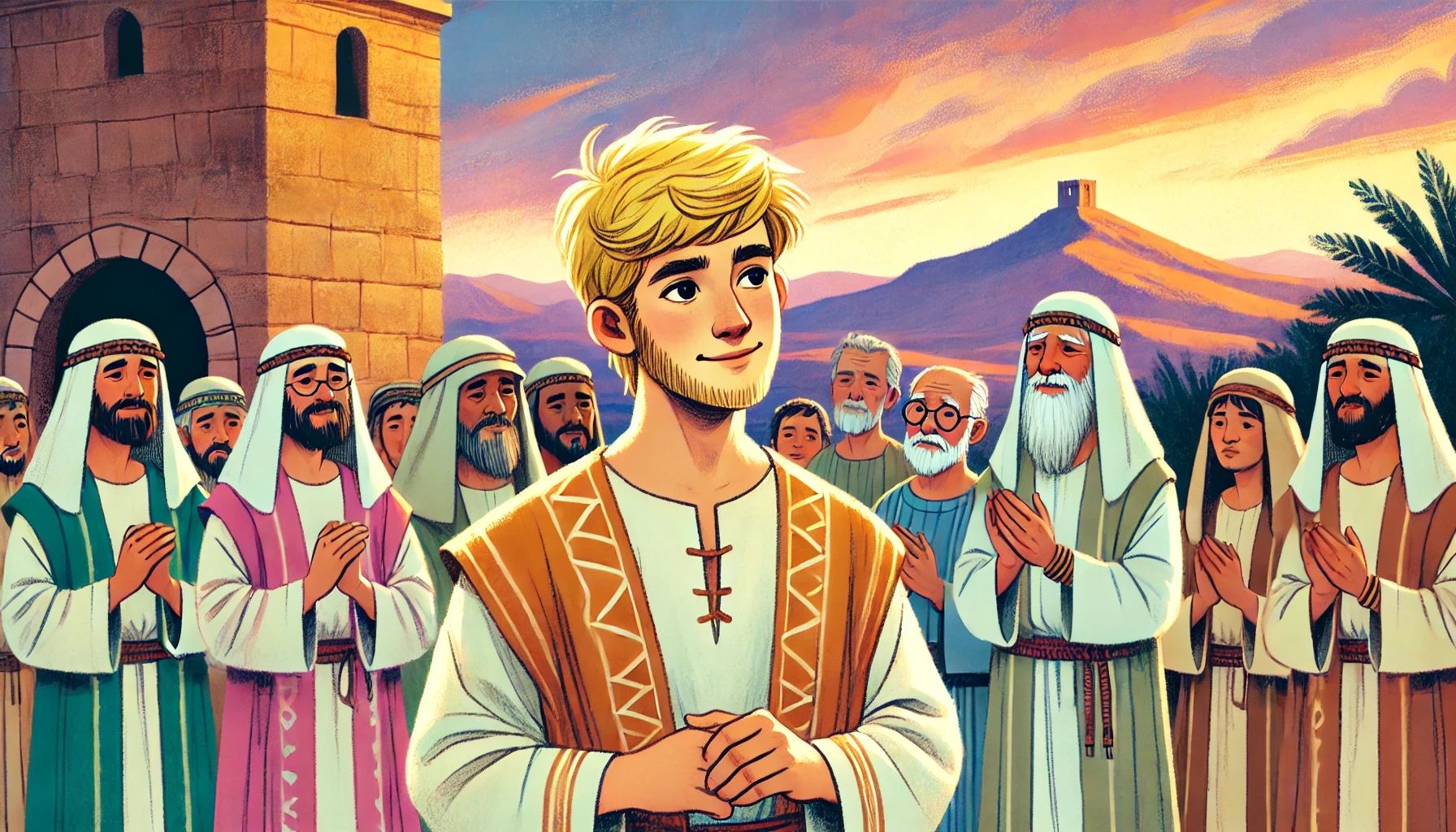 David packte seine Sachen. Auch seine zwei Frauen, seine Soldaten und ihre Familien machten sich auf den Weg. Die Stadt Hebron lag in einer friedlichen Gegend – umgeben von Hügeln und Olivenbäumen. Als sie ankamen, wurden sie freundlich empfangen.