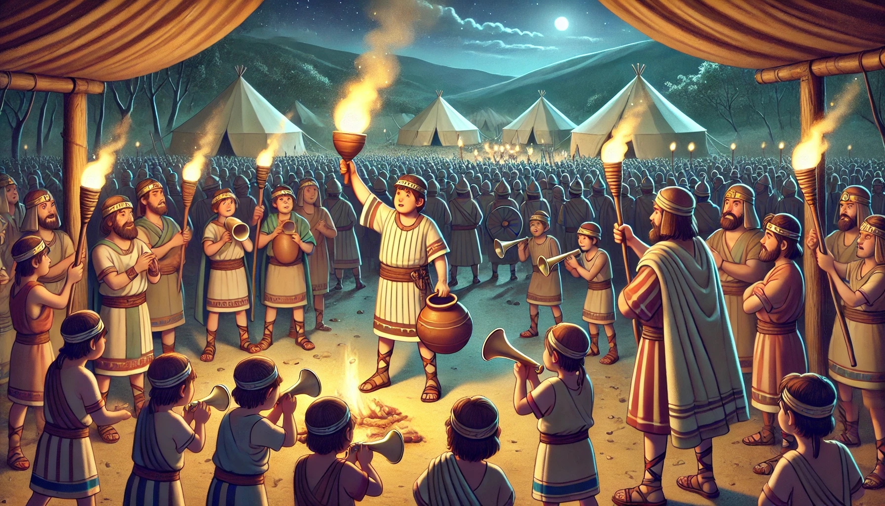 Doch in Gideons Herz klopfte noch ein Rest Angst. Die Midianiter waren unzählbar – wie Sand am Meer, wie Heuschrecken, die Felder verschlingen. Ihr Lager war riesig, ihre Kamele wie Flutwellen, unaufhaltsam.
