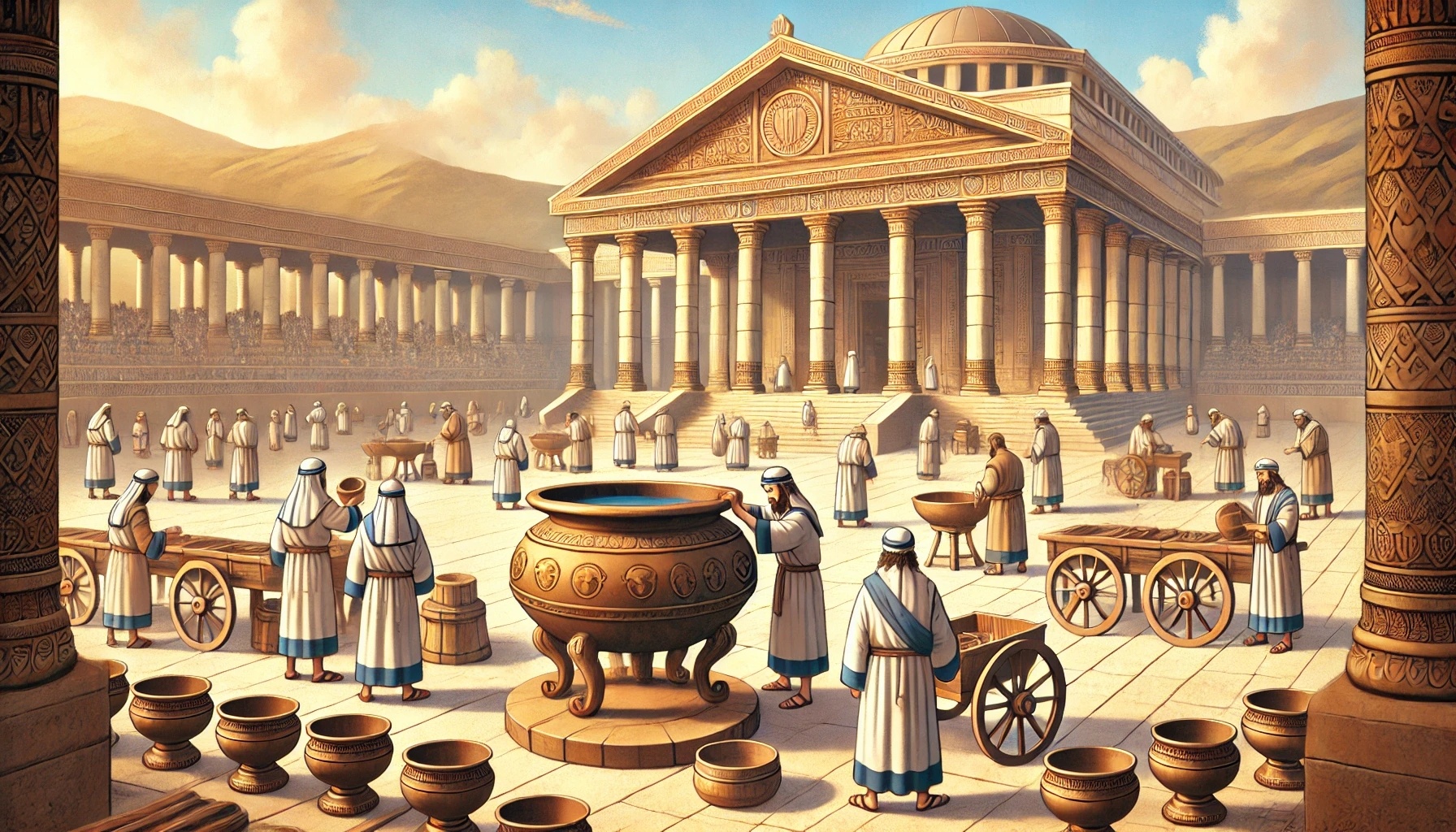 Besonders beeindruckend ist ein riesiges Wasserbecken, das hergestellt wird. Es ist so groß, dass man es „das Meer“ nennt. Es steht auf zwölf kunstvoll gestalteten Rindern, die in verschiedene Richtungen schauen. Dieses Becken ist nicht einfach nur ein Schmuckstück. Die Priester benutzen es, um sich zu waschen, bevor sie ihren Dienst tun.