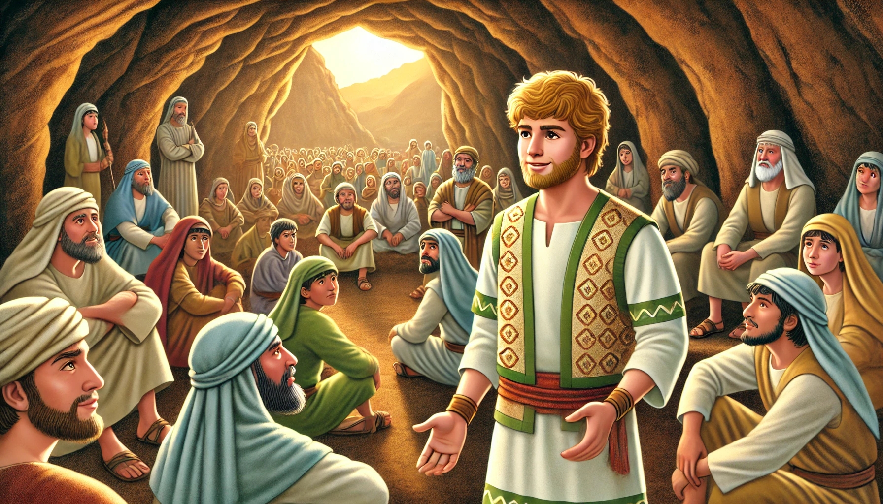 Schon bald kamen die ersten Menschen. Sie hatten gehört, dass David sich dort versteckte. Es waren keine Soldaten oder Helden – sondern Männer, die selbst Angst hatten. Menschen, die Schulden hatten oder vom Leben enttäuscht waren. Manche wurden von Saul verfolgt. Andere hatten einfach keine Hoffnung mehr. Und alle hatten sie eines gemeinsam: Sie vertrauten David mehr als dem König Saul.