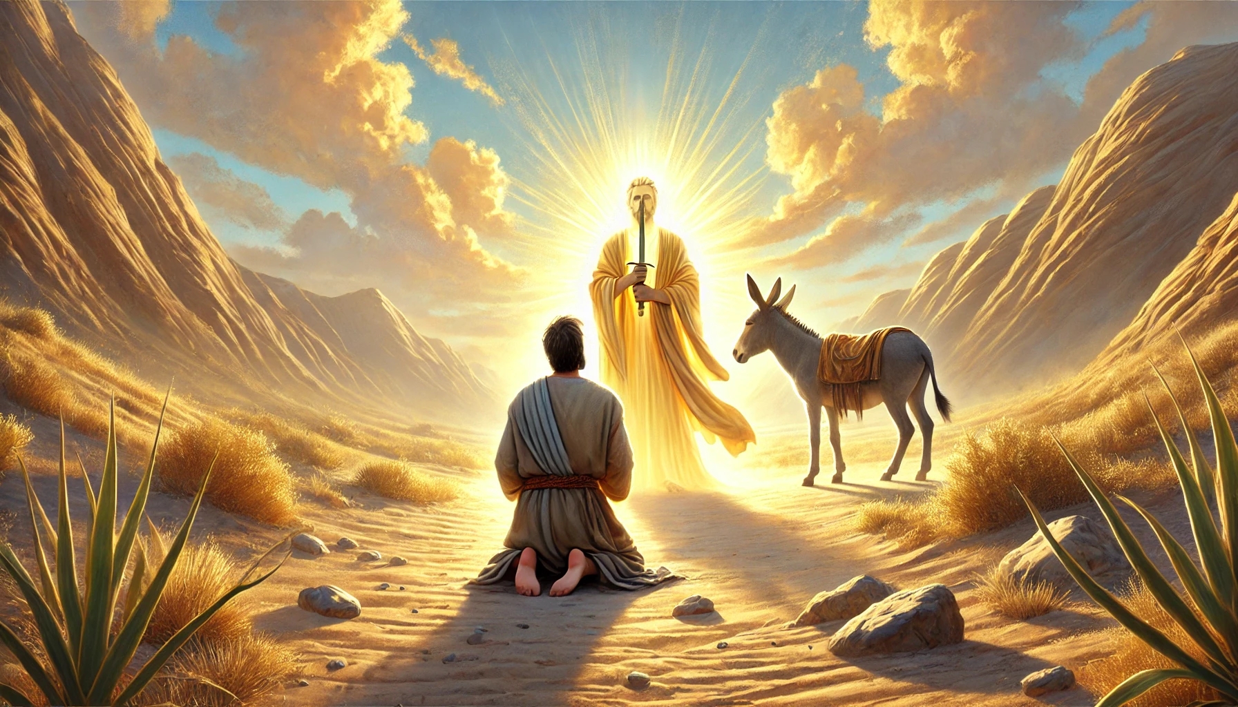 Bileam reitet los, aber der Zorn Gottes entbrennt. Der Engel des Herrn stellt sich in den Weg – die Eselin sieht ihn, Bileam nicht. Dreimal rettet sie ihm das Leben.
