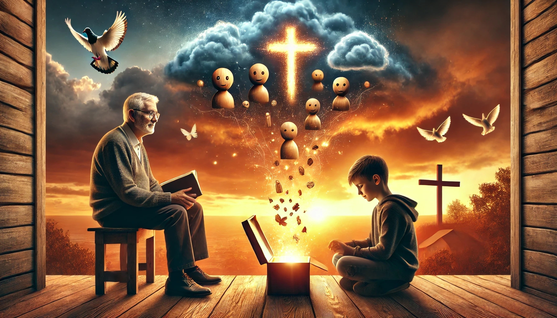 Der Großvater lächelte und holte aus seiner Tasche eine kleine, bemalte Holzkiste mit winzigen Figuren. „Stell dir vor, diese Figuren sind deine Gedanken. Jeder clowneske Gedanke, jeder ängstliche Schauspieler.“ Er nahm eine Holzfigur des „Zweifel-Clowns“ und legte sie in die Kiste. „Du entscheidest, was hier rein- und was raus darf. Und nur die Wahrheiten, die zu Gott passen, bekommen Einlass.“