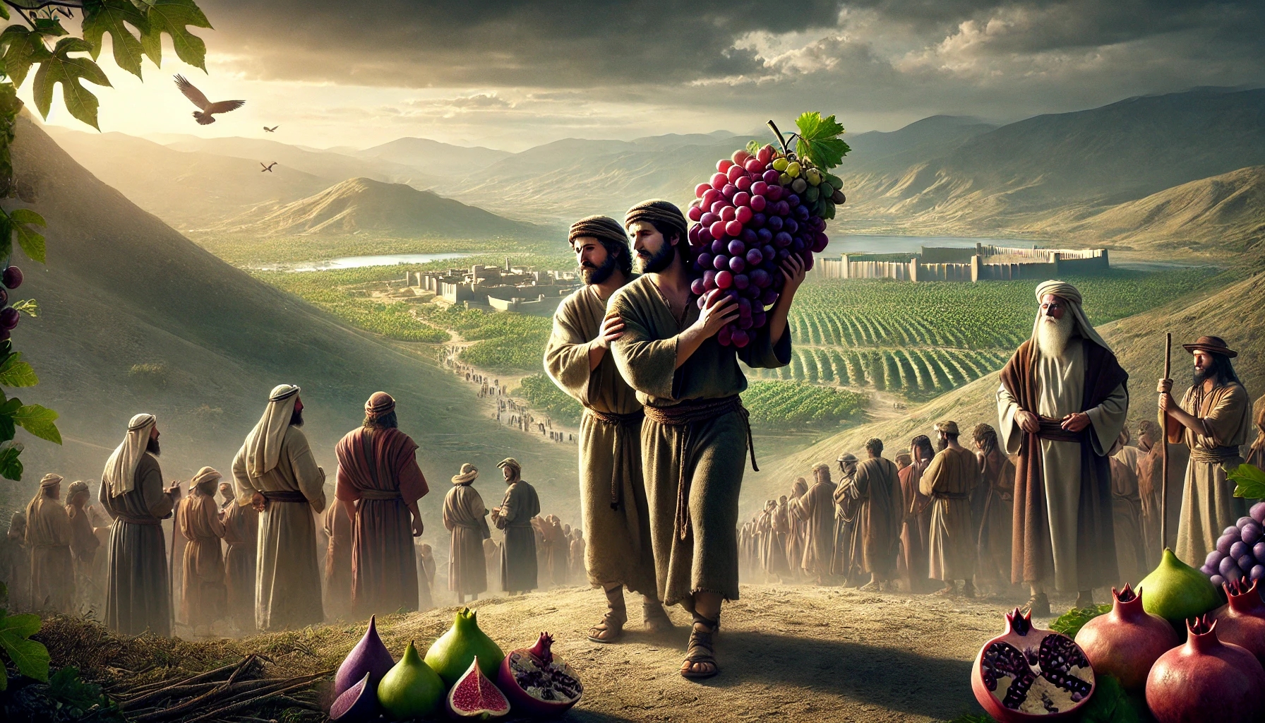 Gott beauftragt Mose, zwölf Kundschafter ins verheißene Land Kanaan zu senden – ein Land, das er den Israeliten geben will. Nach vierzig Tagen kehren sie zurück mit reichen Früchten, aber auch mit Furcht. Zwei Männer – Kaleb und Josua – glauben an Gottes Verheißung, doch zehn andere verbreiten Angst und Misstrauen. Dieser Bericht wird zum Wendepunkt: Das Vertrauen in Gottes Macht wird gegen menschliche Angst aufgewogen.
