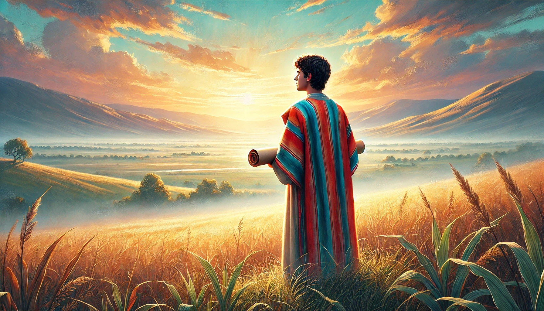 Er trägt das bunte Gewand, das sein Vater ihm geschenkt hat – ein Mantel, der in der Sonne glänzt wie ein Regenbogen. Man merkt: Dieser Junge ist besonders. Und das sehen auch seine Brüder… nur nicht auf die gute Art.