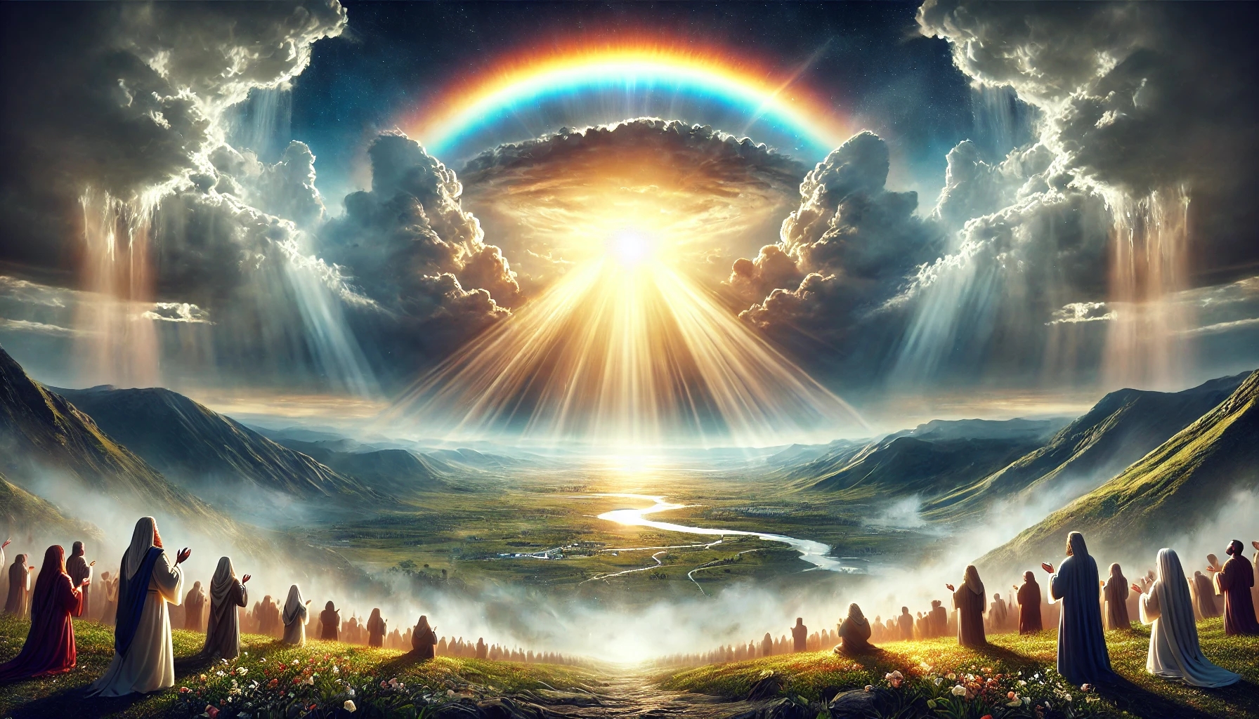 Bald erscheint im Osten eine kleine, dunkle Wolke, etwa so groß wie eine Handfläche. Es ist die Wolke, die den Retter umgibt und aus der Ferne in Dunkelheit gehüllt scheint. Gottes Kinder wissen, dass dies das Zeichen des Menschensohnes ist. In feierlichem Schweigen beobachten sie, wie die Wolke sich der Erde nähert und immer heller und herrlicher wird, bis sie zu einer großen weißen Wolke wird, deren Basis wie eine Feuerflamme leuchtet und über der ein Regenbogen des Bundes sichtbar ist. Jesus kommt nun als mächtiger Eroberer, nicht als „Mann der Schmerzen“ (Jesaja 53,3), der den bitteren Kelch von Schmach und Leid trinkt; er kommt als Sieger im Himmel und auf Erden, um die Lebenden und die Toten zu richten.
